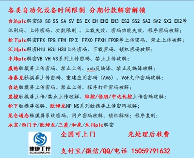 | 信捷plc | XC1解密,XC2解密,XC3解密,XC5解密,XCM解密 信捷只接欠款鎖機 時間限制 分期付款鎖機破解; |