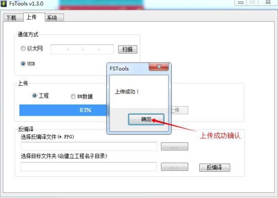 2. 軟件點擊”上傳“,設置通訊方式,選擇上傳工程,點擊上傳按鈕