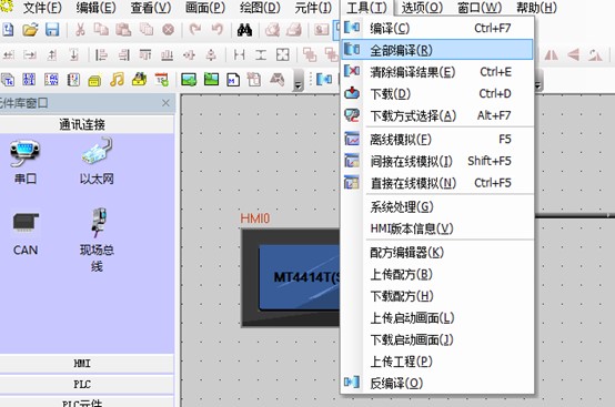 1. 觸摸屏接通電源,軟件內(nèi)工具菜單點(diǎn)擊“全部編譯”,等待編譯完成